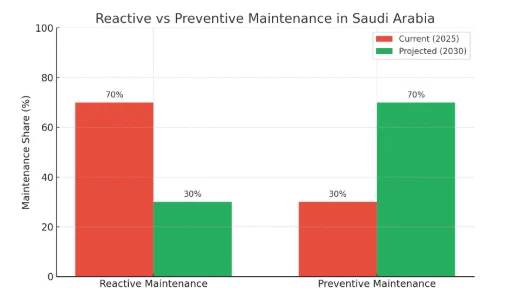 Many facilities across Saudi Arabia—especially older or government-owned assets—still operate under reactive maintenance models, where action is only taken after something breaks.